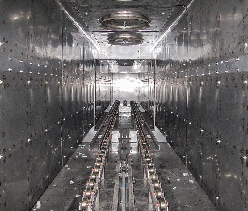 I particolari vengono caricati in appositi cestoni/telai di dimensioni 1500 × 1500 × h 1700 mm, progettati per massimizzare il volume di carico e ottimizzare lo scambio termico. L’avanzamento dei cestoni avviene con movimento passo-passo mediante rotelle folli e spintori a catena, garantendo una movimentazione precisa e affidabile.