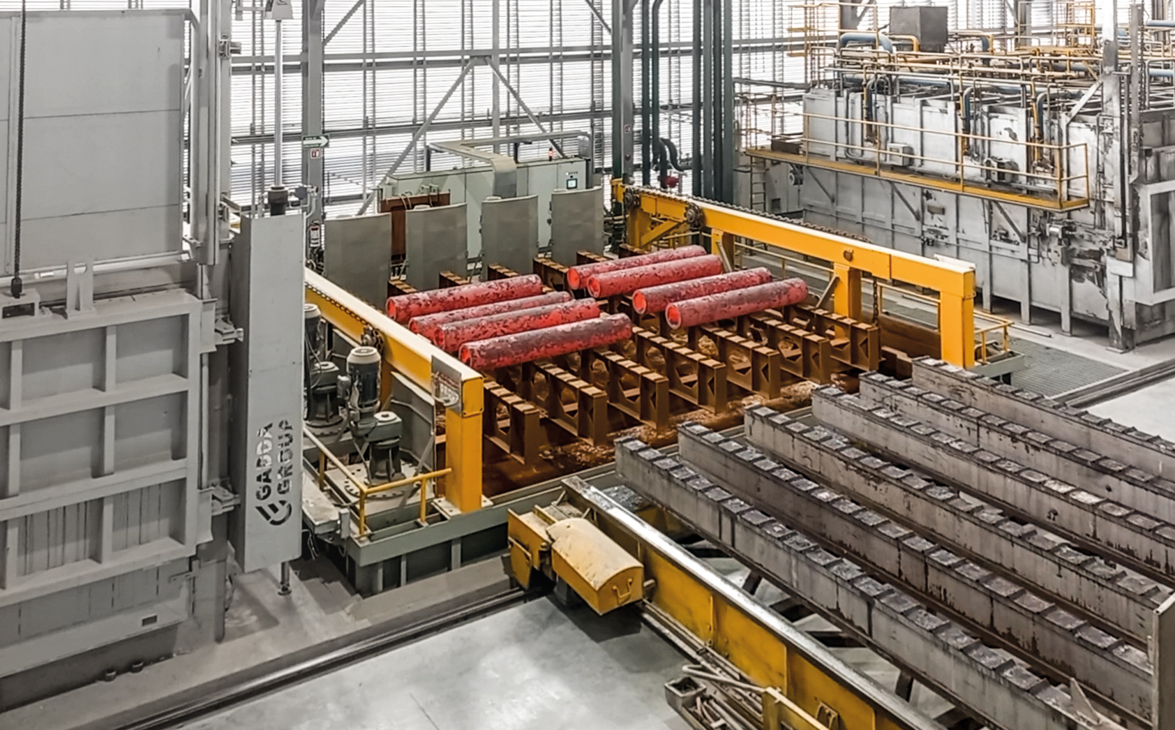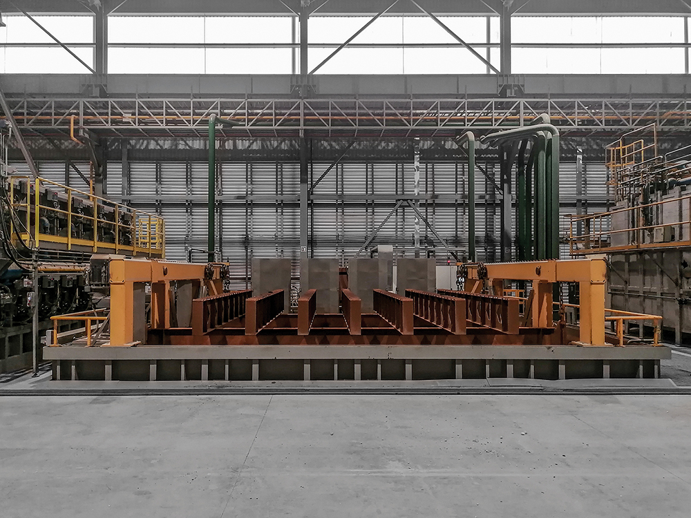 Il discensore, di grandi dimensioni, è progettato per una capacità di carico fino a 30 tonnellate e si interfaccia con una caricatrice a forche, che provvede al deposito e al prelievo del carico da sottoporre a tempra, garantendo un’integrazione efficiente con le operazioni di movimentazione del materiale.